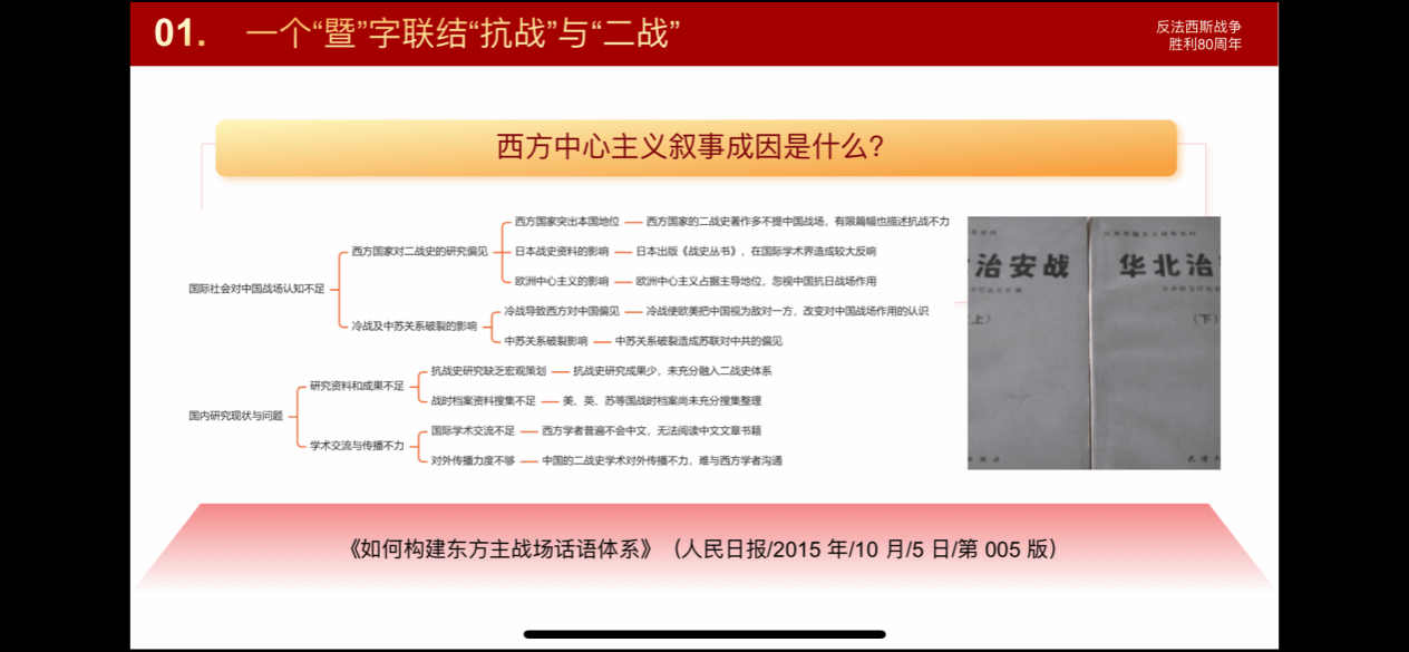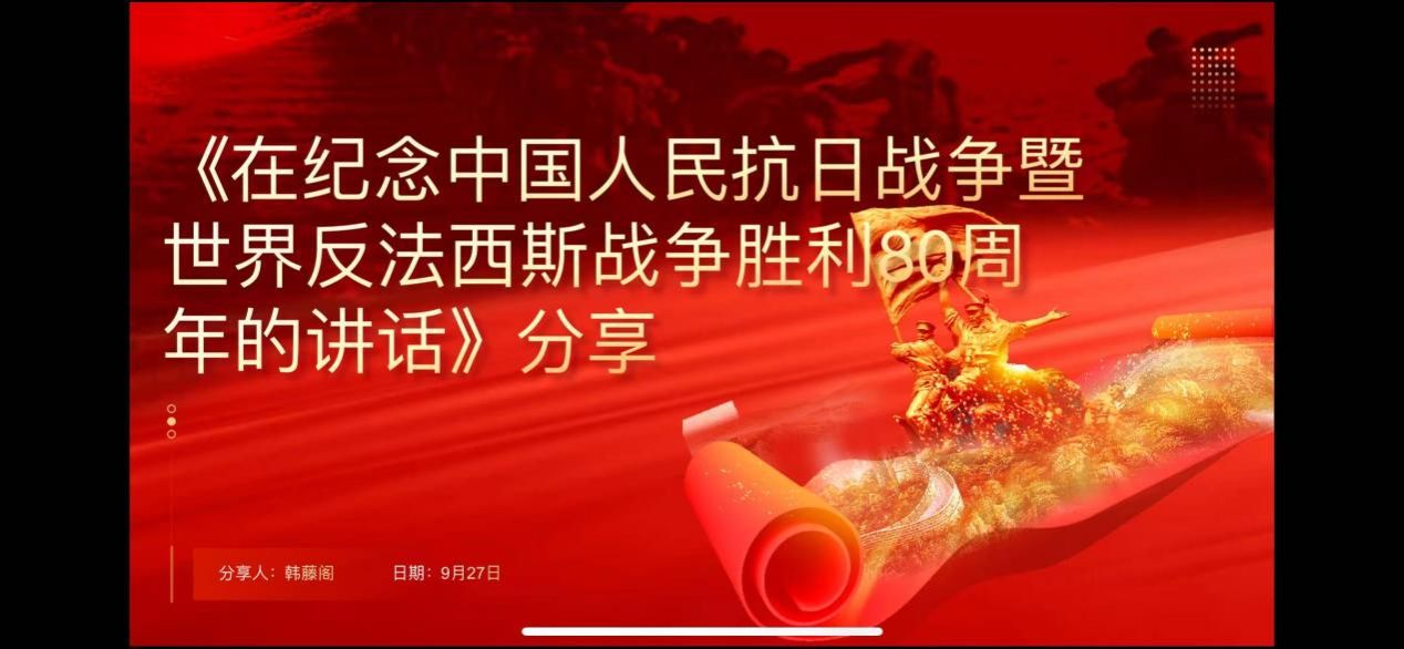 2025年9月25日,西北工业大学马克思主义学院习近平新时代中国特色社会主义思想学习读书小组第六十期活动以《习近平在纪念中国人民抗日战争暨世界反法西斯战争胜利80周年大会上的讲话》为主题进行学习研讨。本次读书会由马克思主义学院鲁杰思政课工作室主办,西北工业大学马克思主义学院赵海霞教授作为对话教师应邀参与,西北工业大学马克思主义学院硕士生李红霞同学主持,通过线上线下相结合的方式,设置线下分会场,邀请导读同学、对话教师、硕博研究生、本科生在学院楼208室交流学习。