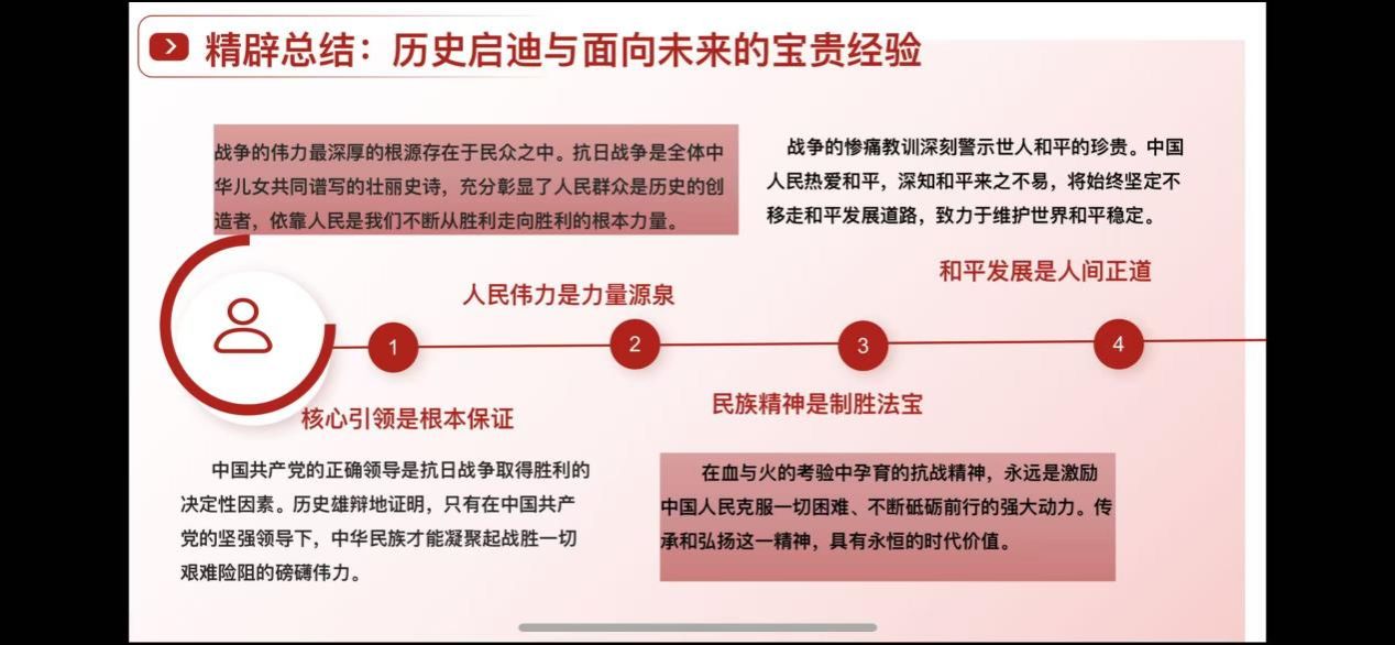 接着,西北工业大学马克思主义学院博士生王璐同学以《铭记伟大胜利 汲取前行伟力》为题,从深刻昭示东方主战场与世界正义的胜利丰碑;深情礼赞民族脊梁与不朽精神的光辉史诗;精辟总结历史启迪与面向未来的宝贵经验;时代召唤铭记历史、共创未来的庄严宣言,四个板块对讲话内容进行了深入浅出地解读。她认为《习近平在纪念中国人民抗日战争暨世界反法西斯战争胜利80周年大会上的讲话》深刻阐释了抗战胜利的伟大意义,深情礼赞了中华民族的英勇抗争,精辟总结了历史经验,并向世界发出了维护和平、共创未来的时代强音。