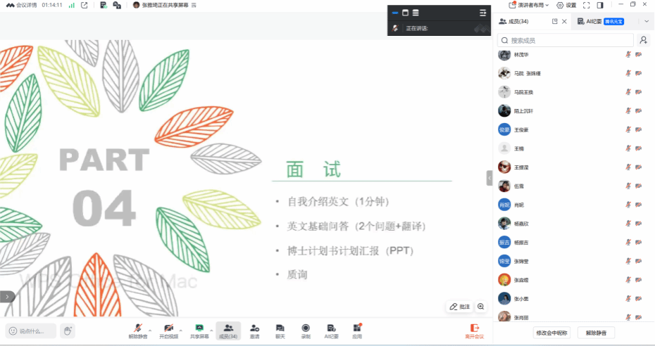 杨江楠系统分享了硕博连读申请的全流程要点,并重点拆解了面试准备。她逐一指导了英文自我介绍、基础问答、计划书汇报与专业质询等环节的应对技巧与核心要点,建议同学们通过提前模拟与充分准备,沉着展现学术潜力。