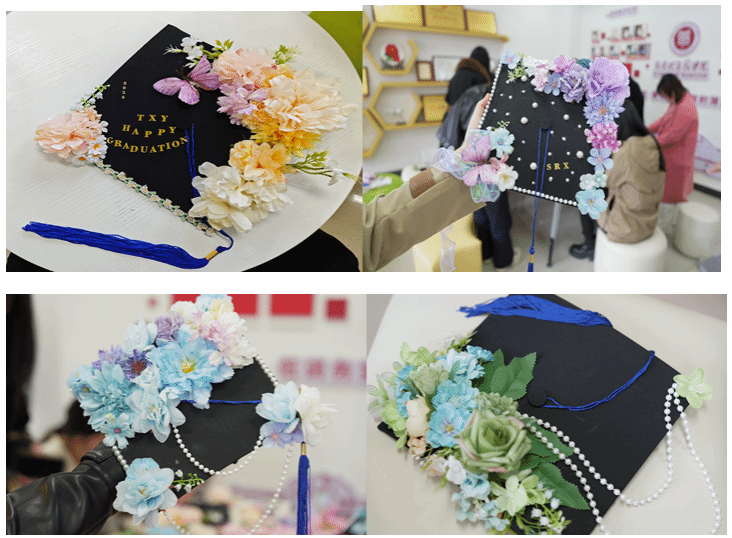 活动现场,学院精心准备了仿真花簇、珍珠串、字母贴、流苏、蕾丝花边等全套DIY材料,品类丰富、色彩多样,为同学们的创意发挥提供了充足保障。大家围坐长桌,或俯身专注用胶枪粘贴花饰,或交流设计思路、相互协作调整布局,指尖流转间,将校园时光与青春心愿融入每一处细节。有的同学以暖橙牡丹与粉紫小花铺陈帽檐,搭配精巧蝴蝶装饰,尽显温婉雅致;有的以浅蓝绣球与珍珠串珠勾勒轮廓,缀以镭射蝴蝶结,兼具优雅与个性;还有的用金色字母贴镌刻专属名字缩写,让学士帽成为独一无二的青春信物。