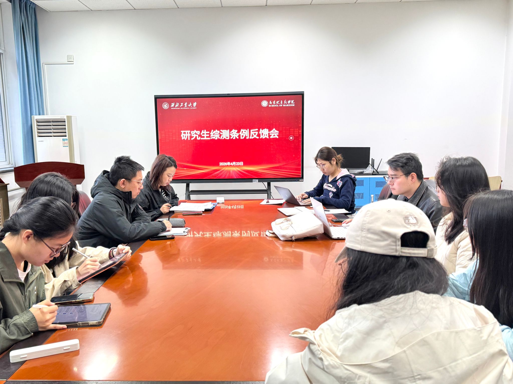 刘敏在研究生综测反馈会上先介绍了条例修订背景与原则,带领与会人员研读条例关键内容,各研究生班长结合前期收集的同学诉求提出意见建议。董润面向全体本科生解读本科综测条例并现场征求意见。